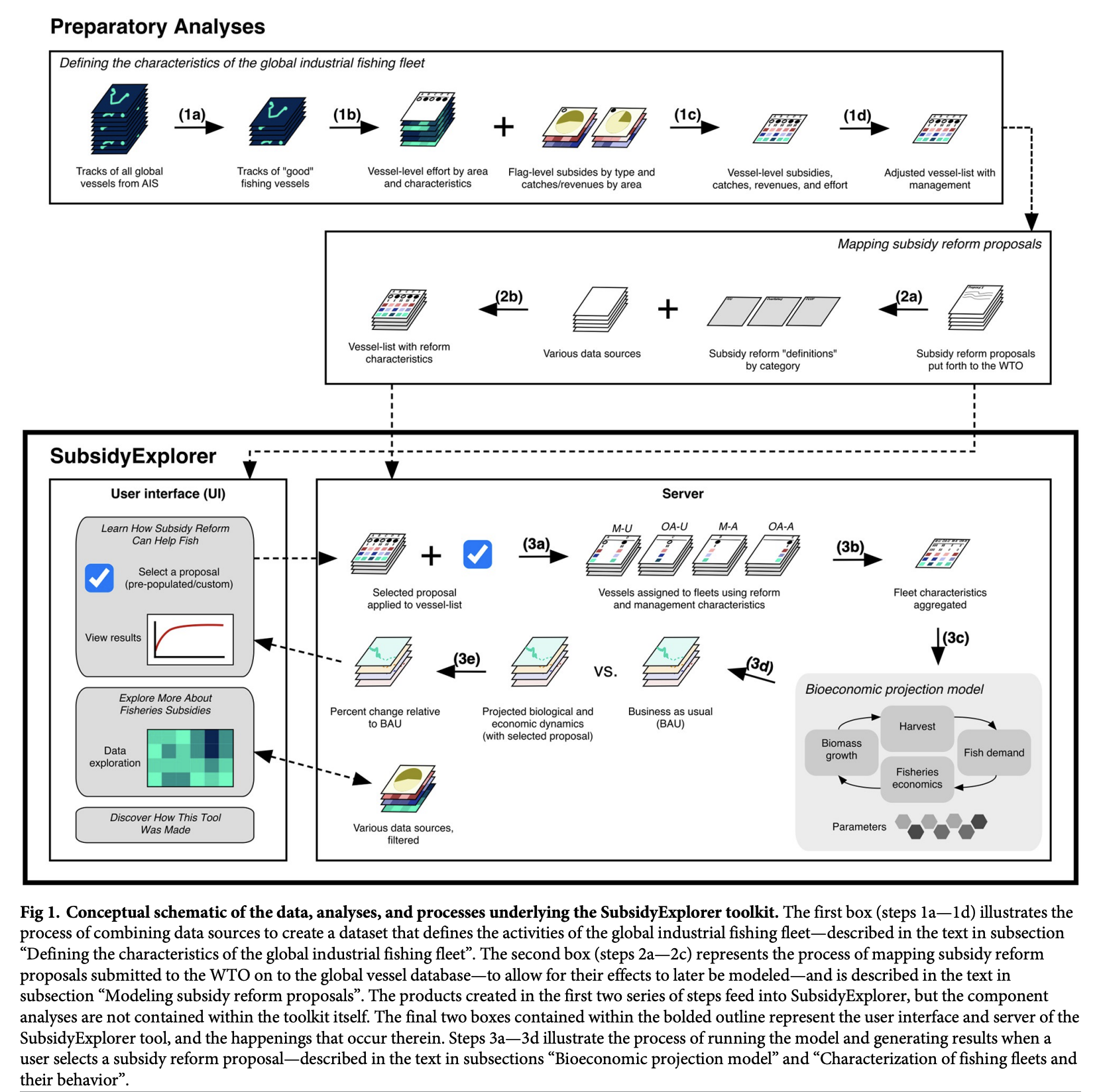 In a new paper just published in PLoS ONE, myself and coauthors Vienna Saccomanno, Matthew Warham, Laura Lea Rubino, Anna Schuhbauer, U. Rashid Sumaila, and Christopher Costello present the decision support tool we created to help inform negotiations at the World Trade Organization about reforming fisheries subsidies. Our paper entitled “SubsidyExplorer: A decision-support tool to improve our understanding of the ecological and economic effects of reforming fisheries subsidies” explains how the SubsidyExplorer tool was built, describes the methodology behind the model contained within it, and presents the key results.